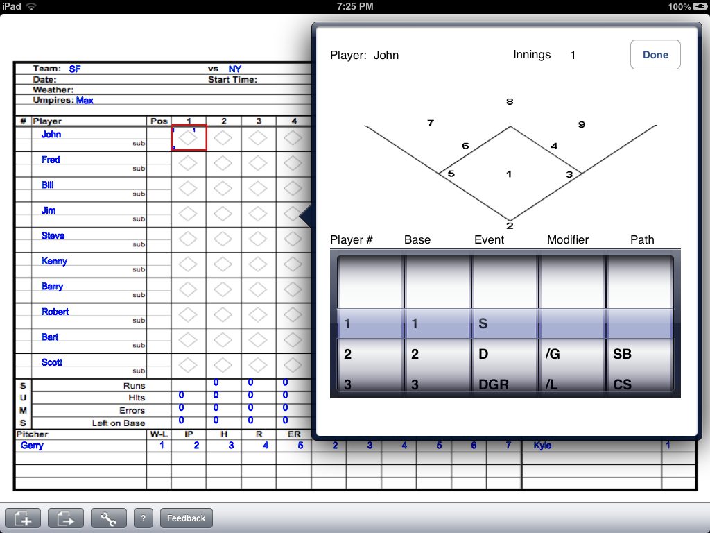 All of the values are generally required fields for each of the popovers. Once you are requested for information in one of the pop overs and simply tap away from it or press the button again and the information will be updated, this is pretty standard iPad behavior. If it needs more information than what is entered a little alert message box will appear requesting you complete all the fields. If there is an event that is not recorded and should be on the sheet in some way then that is a fault or defect, please let me know.